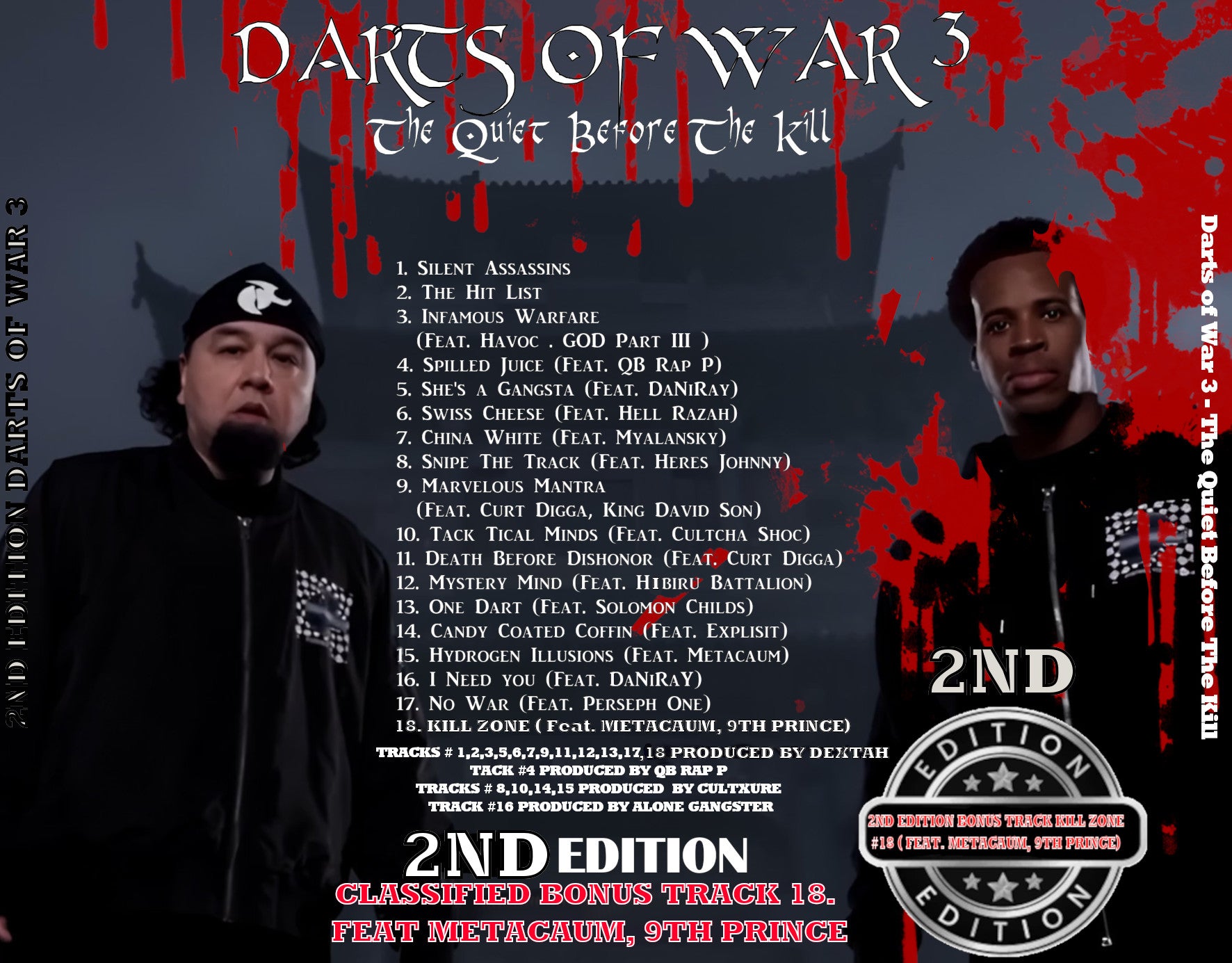 The 2nd Edition – Darts of War 3 Full Album CD LP is a rare, collector-level release that captures the raw energy, gritty storytelling, and collaborative firepower of the underground hip-hop realm. Limited to only 500 copies, this exclusive first pressing offers fans a chance to own a true piece of independent music history before it officially drops on December 11. Presented as a full 18 track experience, the album dives deep into the streets, the struggle, and the sharpened lyrical precision that defines the “Darts” legacy. From the haunting opener “Silent Assassins” to the hard-hitting posse cut “Infamous Warfare” featuring Havoc and GOD Part III, each track is crafted with cinematic intensity and vocal grit. The project continues to raise the stakes with standout collaborations like QB Rap P on “Spilled Juice,” DaNiRay on both “She’s a Gangsta” and the emotional closer “I Need You,” and appearances from respected artists such as Hell Razah, Myalansky, Solomon Childs, and more. Songs like “Marvelous Mantra,” “Death Before Dishonor,” and “Candy Coated Coffin” blend introspection, street philosophy, and verbal warfare into a sonic journey that stays consistent from beginning to end. Includes the Classified 18. Kill Zone (Feat. 9th Metacaum, 9thPrince)